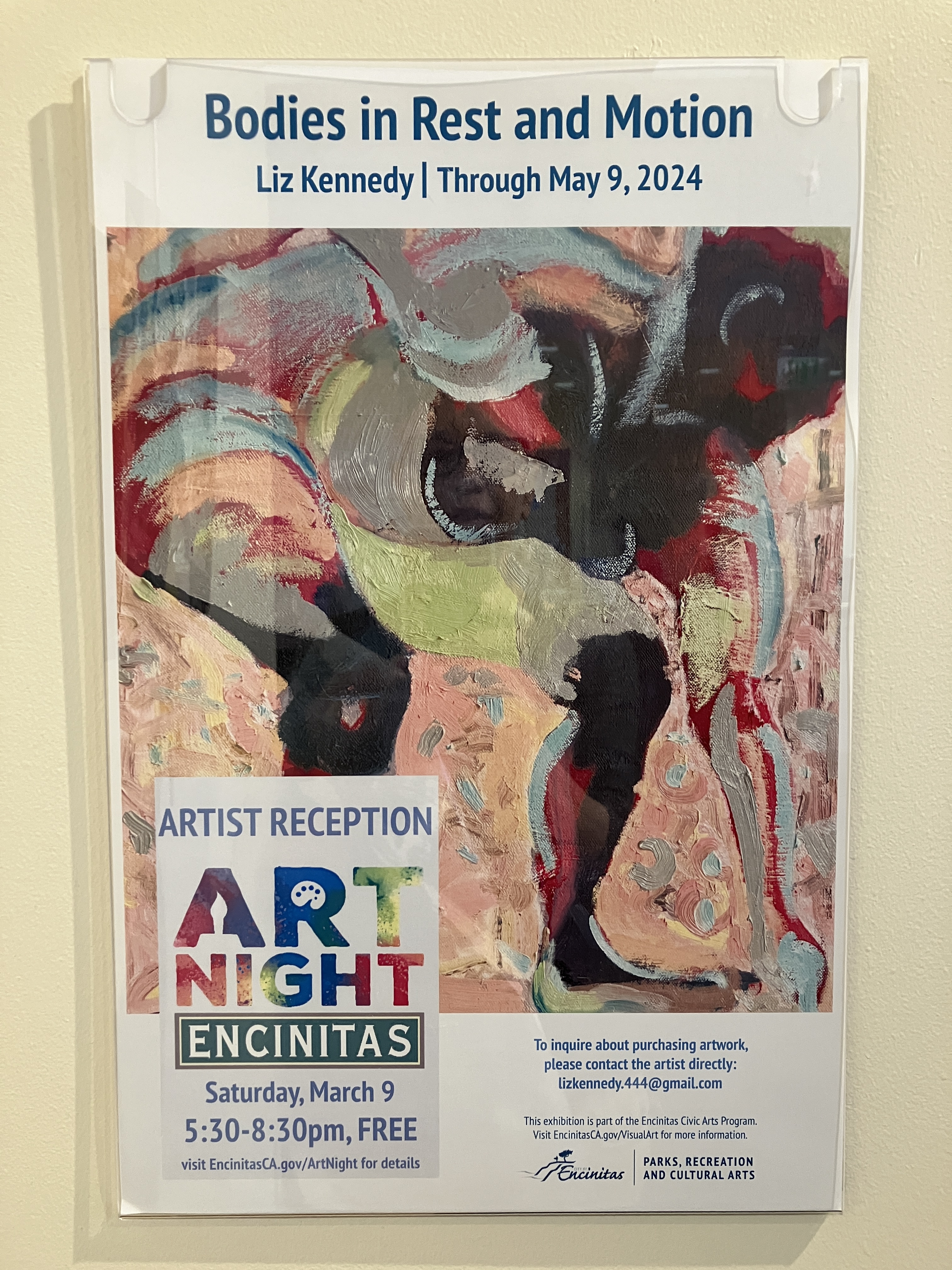 Happy New Year! (let’s hope it’s a good one) 0 January 14, 2024 Written by kennedyliz I am delighted to have this opportunity with the City of Encinitas (CA) Visual Art Program. I have 30 works created from 2020 to December 2024 in the Encinitas Community Center from now until May 9th, 2024. Art Night is March 9 from 5:30 to 8:30 pm. Share this:Like Loading... Related