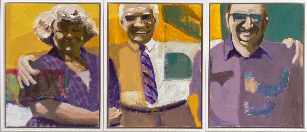 This trio of paintings is from a photograph. That’s my mom, and her two brothers at a family reunion in Montfort, Wisconsin, probably in the 1980’s. We were not around either of my parent’s families very much, so her brothers are a bit of a mystery to me. I wonder how they felt about each other. This triptych was just accepted into a juried show at a gallery with monthly shows.